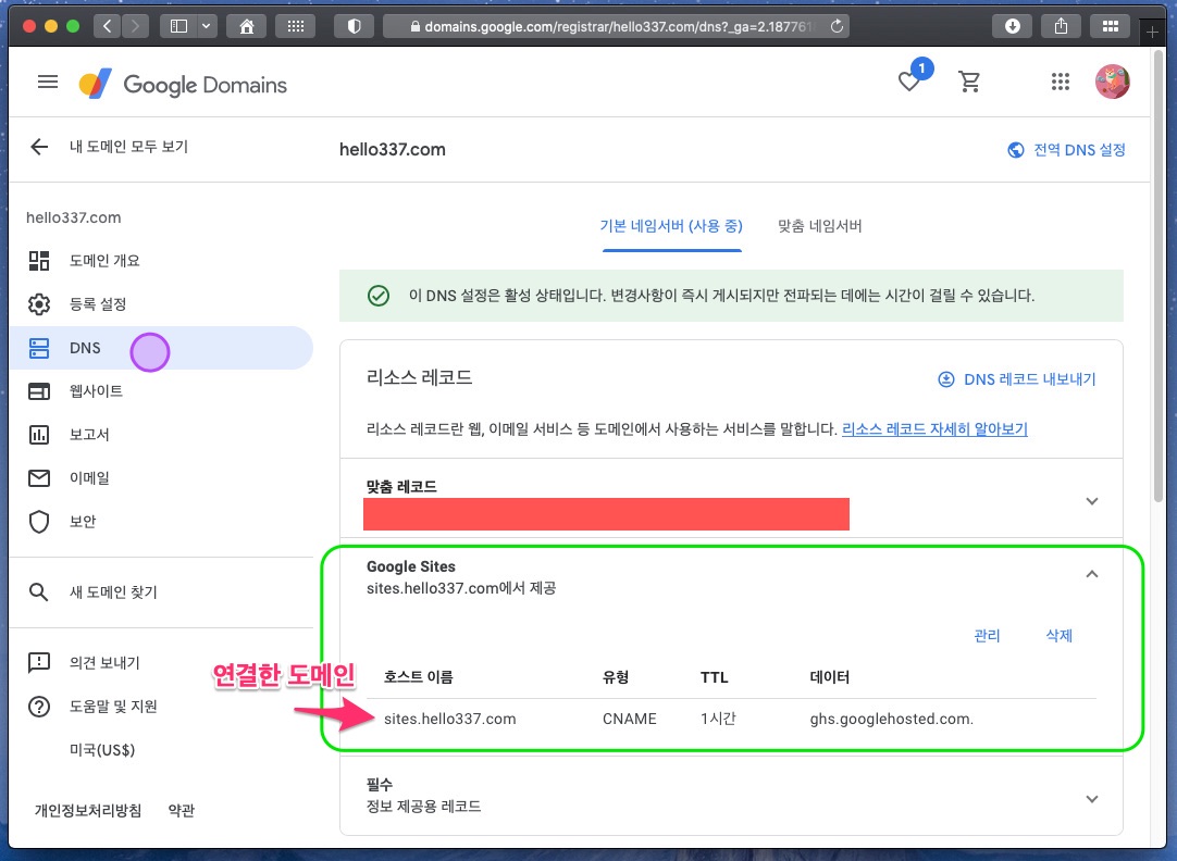 구글 사이트에서 '커스텀 도메인'으로 연결한 경우, 구글 도메인(Google Domains) 서비스의 DNS 메뉴에서 새로 추가한 사이트의 주소가 설정된 것을 확인할 수 있습니다.