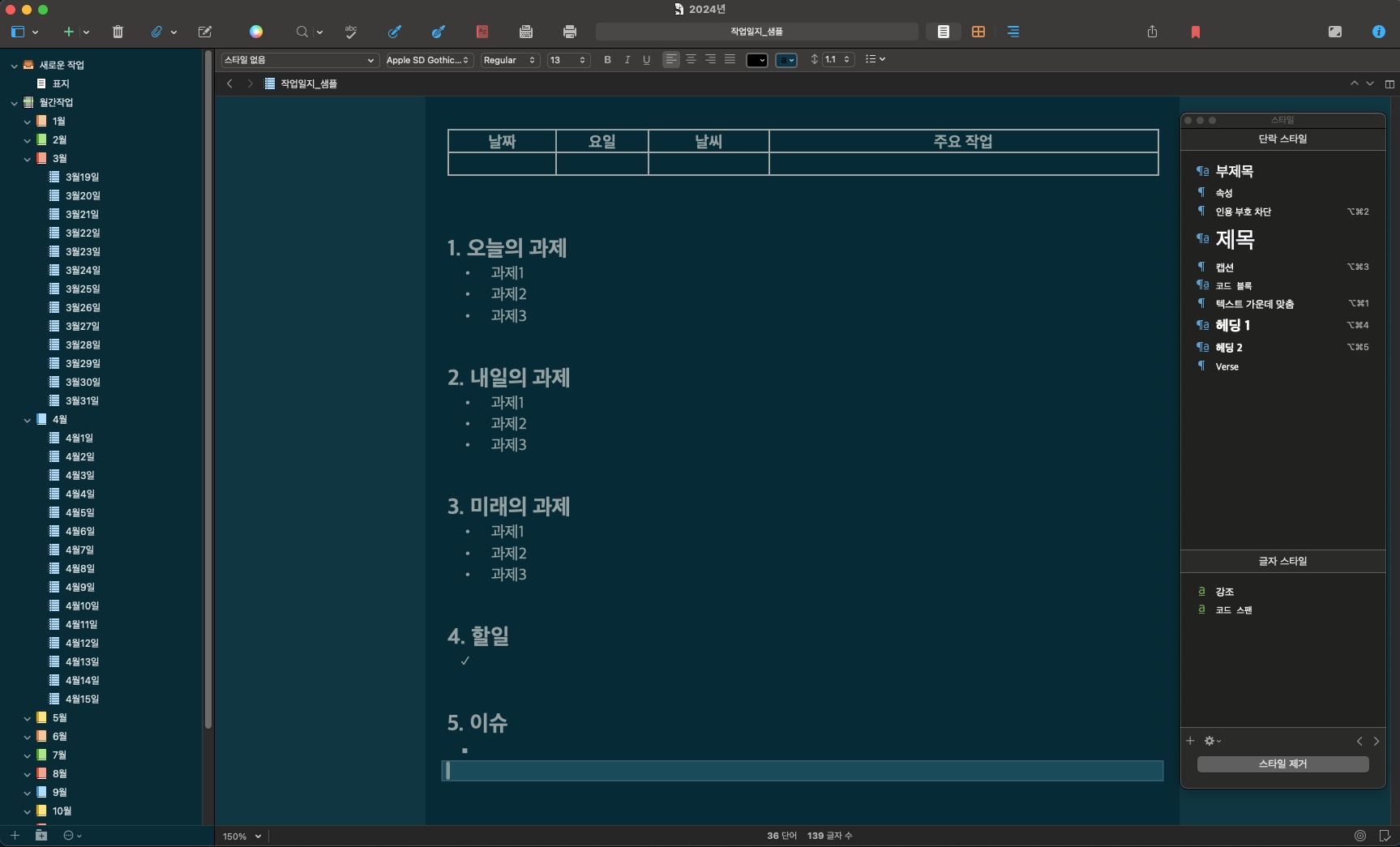 - 설명: 체계적인 그룹화(챕터, 폴더 등의)가 가능해, 규모 있는 책이나 지속적으로 추가되는 글을 작성하는데 매우 좋습니다. 사진이 다량으로 첨부되는 블로그 글을 월별로 작성하며 관리하려 했으나 성능 저하가 발생해, 이미지가 많지 않은 텍스트 위주의 작업 일지나 프로젝트 관리 등의 목적으로 사용합니다. 블로그를 위한 글쓰기의 경우 복사 붙여 넣기를 통해 첨부한 이미지나 서식이 적용되지 않기 때문에 별도의 작업이 필요한 부분은 불편함을 줍니다.