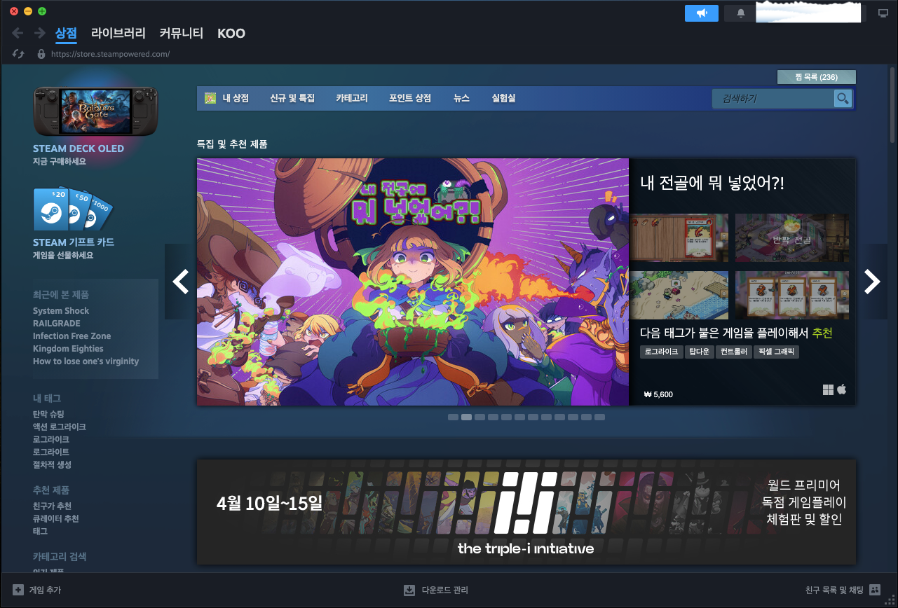 - 설명: 스팀 클라이언트 덕분에 1%대 사용자에도 불구하고 맥으로 종종 게임을 출시해 주고, 즐길 수 있는 것 같습니다. 바쁠 때는 게임 소식만 구경하러 들어갑니다.